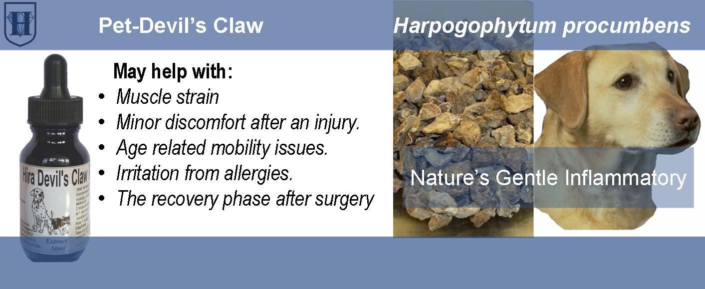 Harpogophytum procumbens: may be used as a mild plant based analgesic Helps lower blood pressure.Bitter principles act to stimulate liver, gall bladder and lower blood sugar. Devil’s Claw stimulates uterine muscles and should not be given to pregnant animals. Look at our plant profile page to learn more about this wonderful plant. Ideal for the older dog